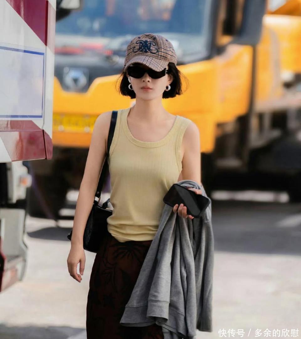 这套造型乍看偏向都会成熟风,但关键在于材质的选择。利落的深色西装外套,搭配质地柔软、颜色温和的内搭,让线条不至于过于锐利。赵丽颖常用这种「外刚内柔」的方式,保留专业感,同时避免年龄感被放大。对于想穿西装却怕显老的人来说,内层材质与色调,就是决定成败的关键。赵丽颖减龄穿搭技巧3:极简背心+格纹棒球帽